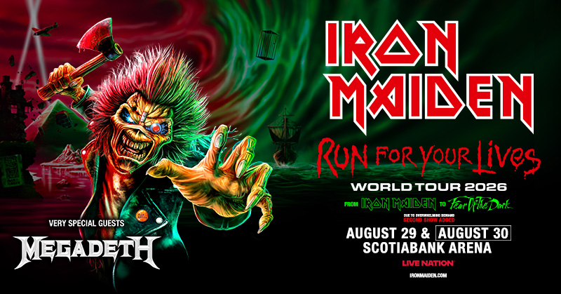IRON MAIDEN at Scotiabank Arena Where Scotiabank Arena, 40 Bay St., Toronto, ON, M5J 3A5 Map When Aug 29/26 07:15 PM - Aug 30/26 11:00 PM Age All Website https://www.ticketmaster.ca/iron-maiden-run-for-your-lives-toronto-ontario-08-30-2026/event/1000635BD09B135D IRON MAIDEN is coming to Scotiabank Arena FOR TWO SHOWS on Saturday, August 29th AND Sunday, August 30th, 2026! Tickets go on sale Friday, October 31, 2025 at 10am CLICK HERE to get your tickets for Show 1! CLICK HERE to get your tickets for Show 2!