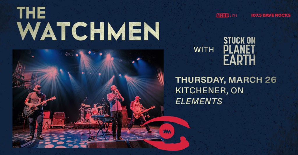 The Watchmen at Elements Where Elements, 90 King Street W., Kitchener, ON, N2G 1A6 Map When Mar 26/26 07:00 PM - Mar 26/26 11:00 PM Age 19+ Website https://www.ticketweb.ca/event/the-watchmen-with-special-guests-elements-tickets/13991244 The Watchmen are coming to Elements on Thursday, March 26th, 2026! With Stuck On Planet Earth! Tickets are on sale NOW. CLICK HERE to get your tickets today!