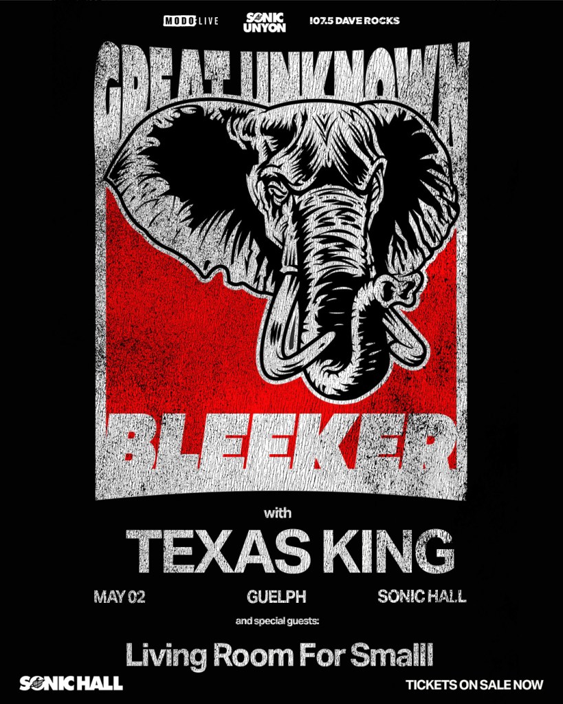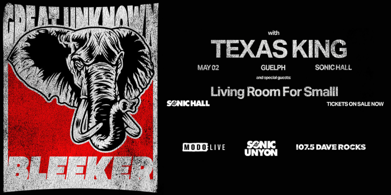 Bleeker with Texas King at Sonic Hall Where Sonic Hall, 12 Wyndham St N, Guelph, ON, N1H 4E5 Map When May 02/26 07:00 PM - May 02/26 11:00 PM Age All Website https://www.ticketweb.ca/event/bleeker-with-texas-king-sonic-hall-tickets/14135404?pl=MODO-LIVE Bleeker, with Texas King, and special guests Living Room For Small, is coming to Sonic Hall on Saturday, May 2nd, 2026! Tickets are on sale NOW. CLICK HERE to get your tickets!